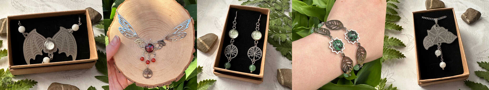 Eigen ontwerp sieraden met handgemaakte elementen. Gecreëerd met liefde en een vleugje magie. Let op, dit is een wisselend assortiment omdat veel sieraden ‘one of a kind’ zijn. Zie je iets leuks? Wacht dan niet te lang ;).
